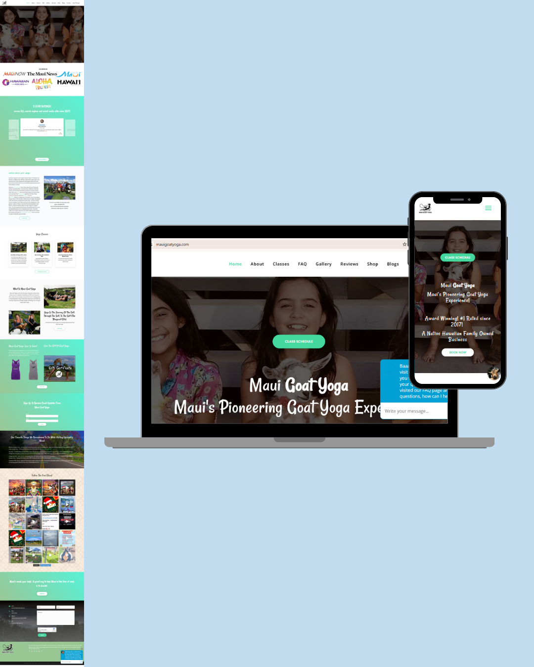 To showcase and promote Maui Goat Yoga — a unique outdoor yoga experience in Upcountry Maui where participants practice yoga alongside friendly, playful goats. The site aims to drive bookings for classes, private events, and promote the brand’s personality and offerings.